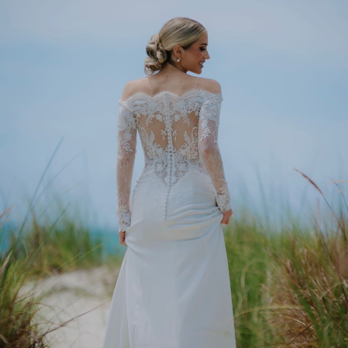 Sarah dazzled everyone in her princess-cut Emerald dress featuring a charming off-the-shoulder neckline. This gown not only highlighted her figure but also exuded an air of sophisticated and timeless elegance. To complement her look for the ceremony, Sarah adorned herself in the lace Brigitta model, adding a delicate and romantic touch to her appearance.