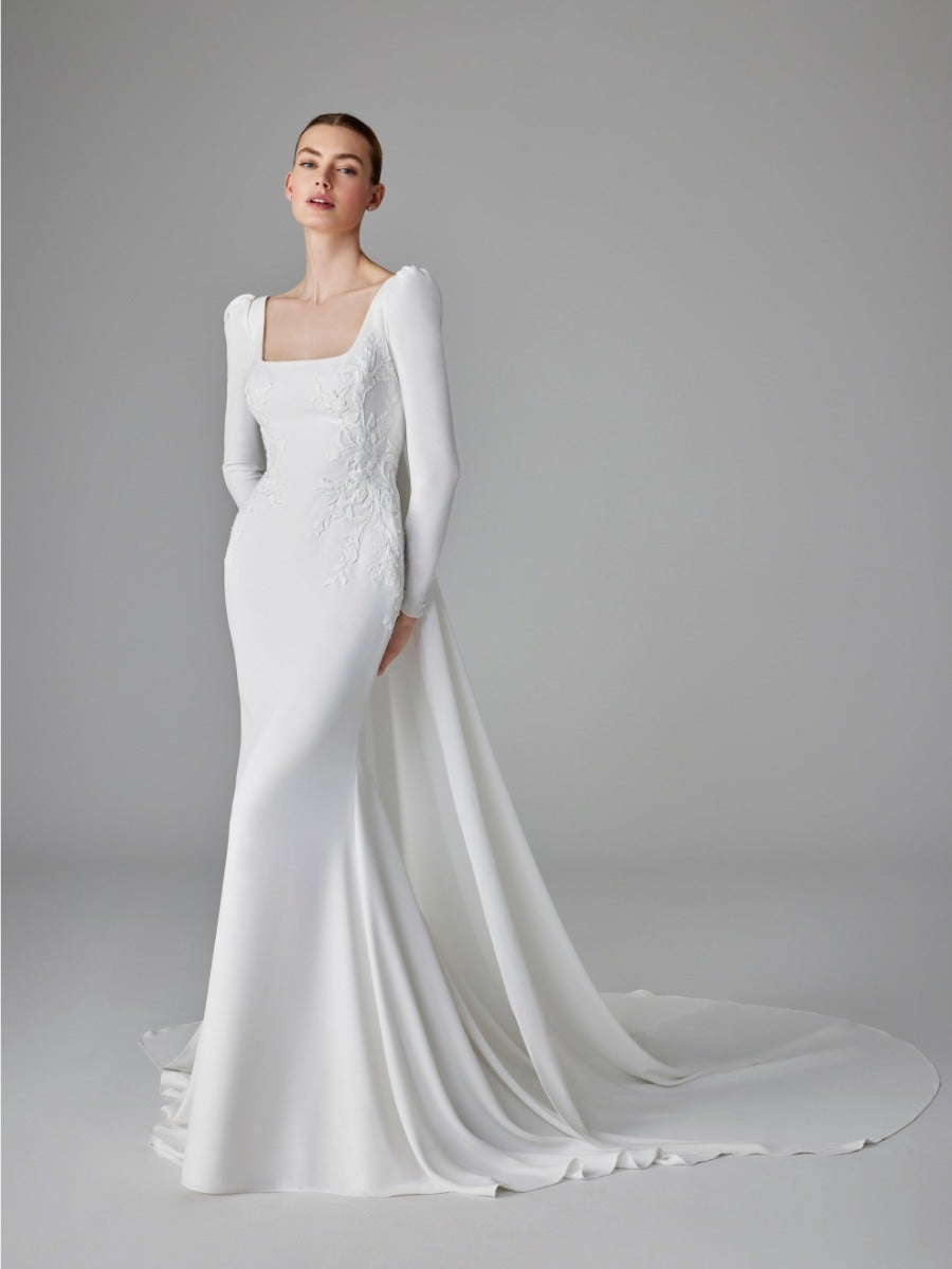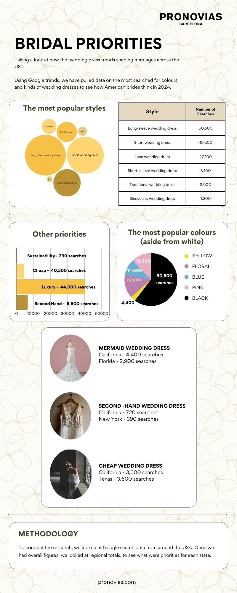 For brides who love classic styles, lace wedding dresses are a top choice, searched by 7,600 brides each month. If you’re drawn to timeless sophistication, a long-sleeve wedding dress (6,500 searches) may be perfect for a refined, regal look.