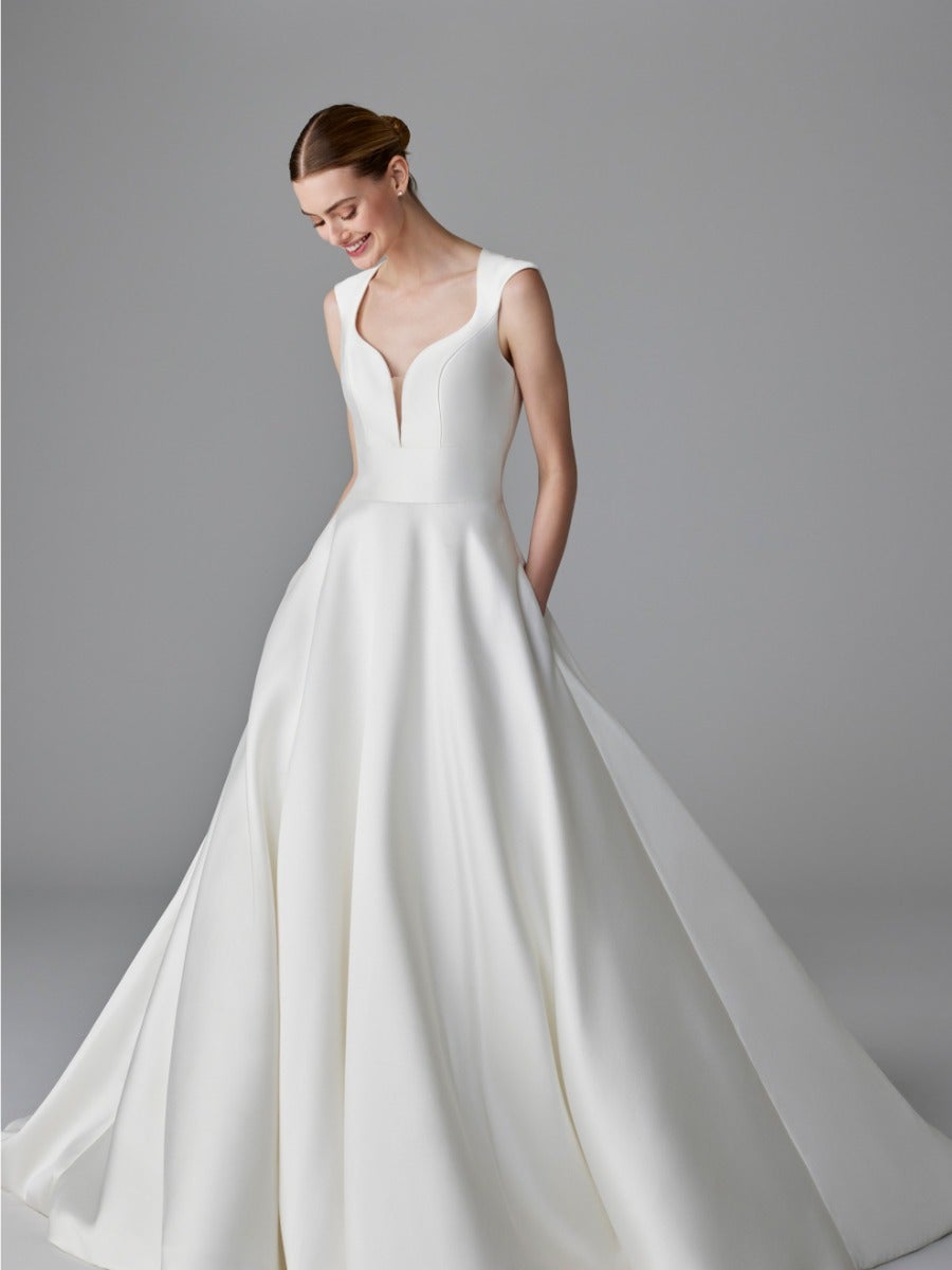 Si bien el corte imperio es una opción encantadora y versátil, los cortes A y princesa son alternativas igualmente románticas que resaltan la belleza de la novia de maneras distintas. Por ejemplo, el vestido de novia corte A es conocido por su silueta clásica y su capacidad para favorecer casi cualquier tipo de cuerpo, ya que se ajusta al torso y fluye gradualmente hacia abajo en forma de “A”, creando una apariencia elegante y alargada. Es ideal para novias que buscan un equilibrio entre simplicidad y sofisticación.