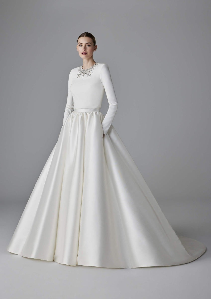 Enero ofrece una atmósfera invernal y mágica, perfecta para ceremonias elegantes y sofisticadas. Los vestidos de novia con mangas largas, tejidos nobles como el crepé y detalles estructurados son ideales para este mes. Las siluetas corte A con cuello alto o diseños sirena con mangas joya destacan entre las tendencias de alta costura.